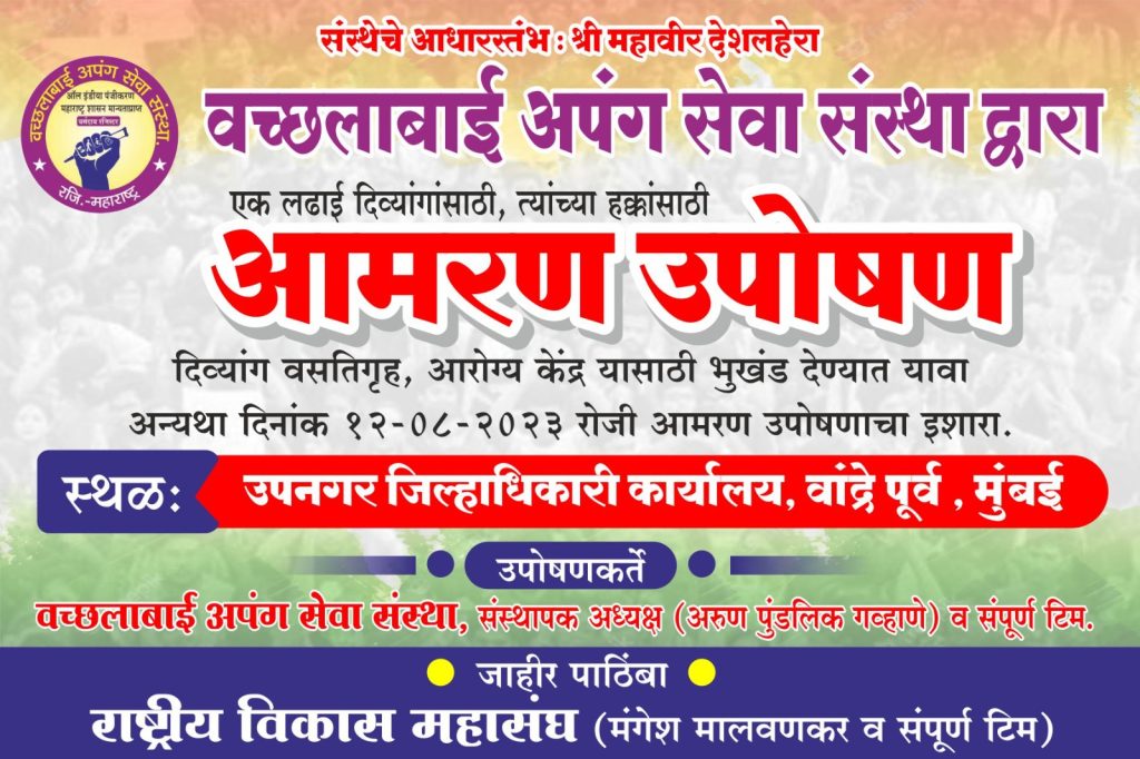 मुंबई,वच्छला अपंग सेवा संस्था की भूख हड़ताल की चेतावनी सरकार से बार-बार अनुरोध के बावजूद मांग पूरी नहीं होने पर यह कदम उठाया है. वच्छलाबाई अपंग सेवा संस्था के सदस्यों पर हो रहे अत्याचार को लेकर संस्था के अध्यक्ष अरुण गव्हाणे ने 12 अगस्त को आमरण अनशन की चेतावनी दी है. वच्छला अपंग सेवा संस्था विकलांग व्यक्तियों के पुनर्वास के लिए काम करती है। सरकार के जीआर के मुताबिक 2009 से उपनगरीय जिला अधिकारी सरकार से विकलांगों के लिए भूखंड की मांग कर रहे हैं. सरकार ने कई साल पहले भूखंड देने आश्वासन दिया था .जमीन का सातबारा, नक्शा, प्रॉपर्टी कार्ड और भूखंड से जुड़े सभी तरह के दस्तावेज सरकार को सौंपे और जमीन कि मांग कि गयी. और उस समय सरकार ने इस संबंध में संबंधित विभाग को आदेश दिया था, लेकिन लगातार फोल्लो अप कर सरकार को सभी दस्तावेज सौंपने के बावजूद संगठन की मांग पूरी नहीं हुई. कई सालों की मेहनत के बाद संस्था को लगा कि वच्छला अपंग सेवा संस्था की मांग पूरी हो जाएगी, लेकिन पालन-पोषण के बावजूद सरकार आनाकानी कर रही है. अत: यदि वच्छला अपांग सेवा संस्थान के सदस्यों पर अत्याचार होता है तथा विकलांगों को सरकारी कानून के अनुसार न्याय नहीं मिलता है आज दि. 12 अगस्त 2023 को संस्थान के सदस्य बांद्रा पूर्व मे जिल्हाधिकारी कार्यालय पर दोपहर 12:30 बजे आमरण अनशन करने जा रहे हैं। संगठन ने चेतावनी दी है कि संबंधित ऑन-ड्यूटी अधिकारी और सरकार इस व्रत के दौरान दिव्यांगों को कुछ भी होता है तो उस कि जिम्मेदारी सरकार और प्रशासन कि होगी l
