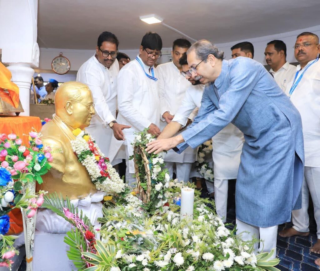 मुंबई: महापरिनिर्वाण दिनानिमित्त पक्षप्रमुख माननीय उद्धवसाहेब ठाकरे यांनी दादर स्थित चैत्यभूमी येथे भारतीय राज्यघटनेचे शिल्पकार, महामानव, भारतरत्न डॉ. बाबासाहेब आंबेडकर यांना पुष्पांजली अर्पण करून अभिवादन केले.