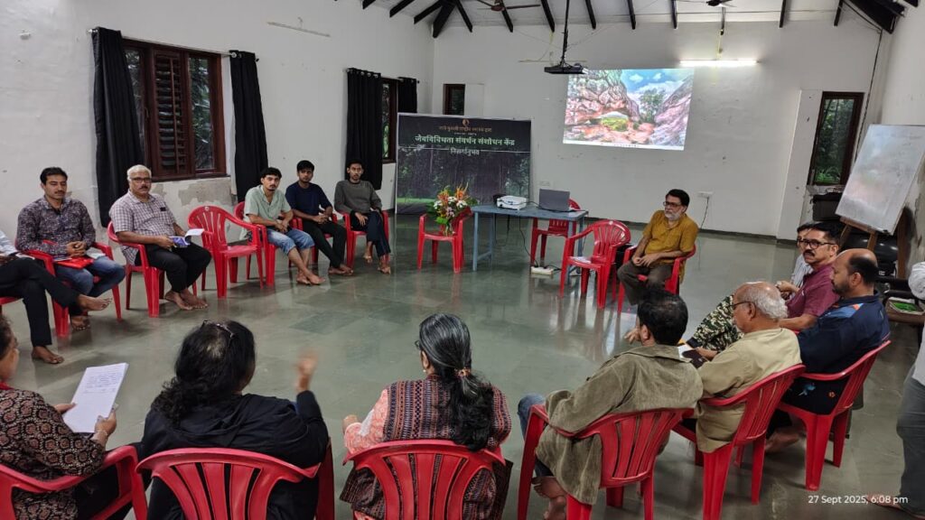 शनिवार दिनांक २७ सप्टेंबर २०२५ रोजी संध्याकाळी ६ वाजता कार्यशाळेची सुरुवात झाली. पावसाचा रेड अलर्ट असतानाही या निसर्गानुभव कार्यशाळेत चिपळूण, महाड, माणगाव, भीरा, नवी मुंबई व मुंबईतील जैवविविधता विषयात रुची असणारे सहभागी झाले होते. पहिल्या सत्रात पार्थ बापट यांनी सुरवातीलाच मानवी उत्क्रांतीचा इतिहास शिकवत असतानाच जैवविविधता व माणूस यातील संबंधही उलगडून दाखवला. जैवविविधता म्हणजे काय आणि तिच्या जतन संवर्धनाचे महत्व पार्थ बापट यांनी सोप्या शब्दांत मांडले व डॉ. दिप्ती बापट यांनी त्या मांडणीत तांत्रीक बाबी समजावून सांगितल्या. मुसळधार पावसाच्या तालावर चाललेलं हे सत्र कठीण विषय असूनही संपूच नये इतकं रंजक झालं होतं. रात्रीच्या जेवणानंतरच्या सत्रात वरील विषयांवरील तीन माहितीपट बघितले व त्यावर चर्चा केली.