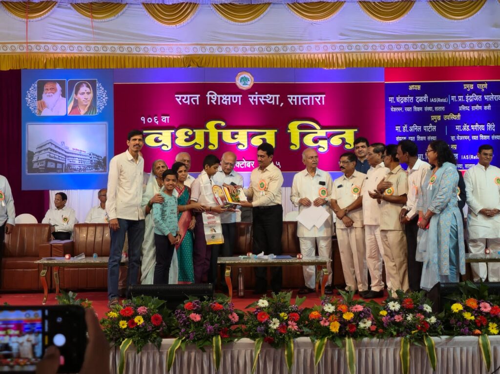 मुंबई: शिक्षणमहर्षी कर्मवीर भाऊराव पाटील यांच्या रयत शिक्षण संस्थेचा 106 वा वर्धापन दिन दिनांक 04 ऑक्टोबर 2025 रोजी सातारा येथील कर्मवीर समाधी परिसरात मोठ्या उत्साहात आणि प्रेरणादायी वातावरणात संपन्न झाला. या दिमाखदार सोहळ्यात संस्थेच्या वतीने विशेष कामगिरी करणाऱ्या शिक्षक व विद्यार्थ्यांचा पुरस्काराने गौरव करण्यात आला.