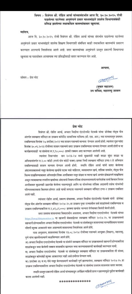 पुढे या प्रकरणाचे धागेदोरे कोणत्या दिशेने जातात, हे पाहणे उत्सुकतेचे ठरणार आहे.दरम्यान शिक्षण विभागाने या बाबत स्पष्टीकरण देत आपले म्हणणे मांडले आहे आणि रोहित आर्या यांच्या संस्थेने परस्पर शाळांकडून आर्थिक व्यवहार केल्याची माहिती दिली आहे.