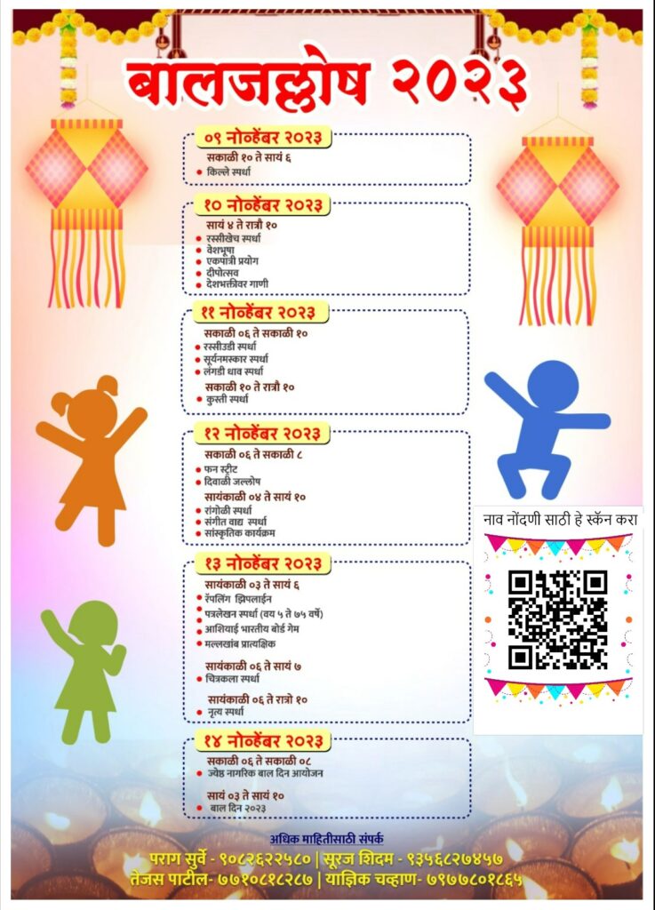 मुंबई,विले पार्ले व आसपास च्या परिसरातील बालगोपाल ज्या उत्सवाची वाट पाहत असतात,त्या जल्लोषची तरिख यंदा 9 ते 14 नोव्हेंबर 2023. पर्यंत कार्यक्रम ठरला.वाचकांच्या माहिती करिता कार्यक्रम पत्रिका येथे देत आहोत. मुंबई च्या धाकधूकी च्या जीवनात बाळ दिनानिमित्त चिमुकल्यांना काही दिवस आनंदाचे क्षण लुटण्याची संधी मिळणार आहे. तसेच त्यांच्या सोबत इतर नागरिकांना ही आनंद घेता येणार.